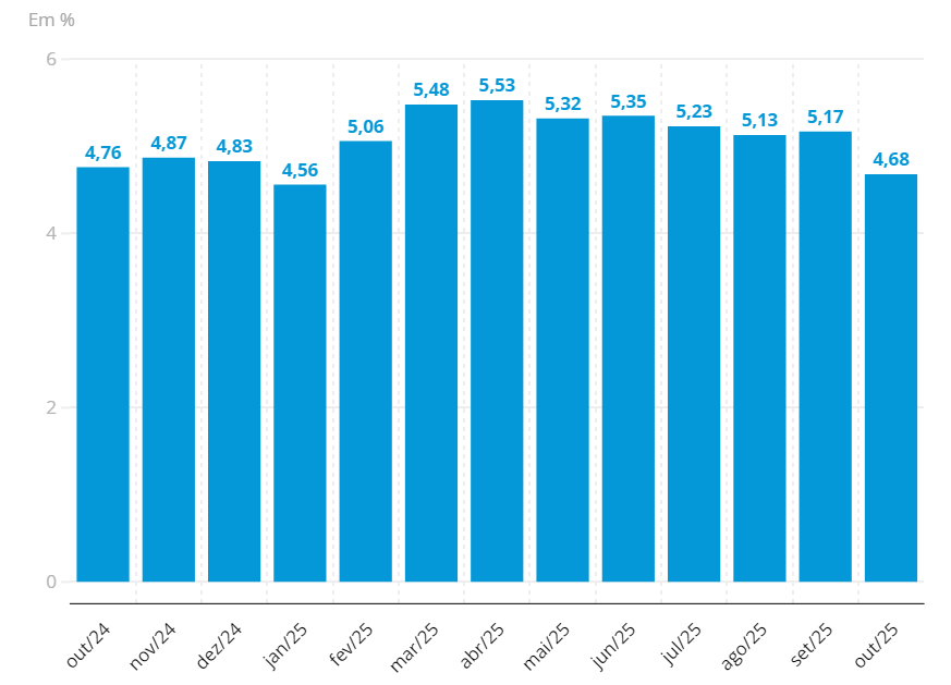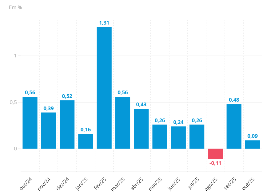 Após alta de 0,48% em setembro, pressionada principalmente pelos preços da conta de luz, a inflação medida pelo IPCA desacelerou para 0,09% em outubro, o menor índice para esse mês desde 1998, conforme dados divulgados pelo IBGE. O resultado surpreendeu os analistas, que esperavam alta de 0,15%. No acumulado do ano, a inflação está em 3,73%, e nos últimos 12 meses, em 4,68%, aproximando-se do teto da meta estabelecida pelo Conselho Monetário Nacional (CMN).